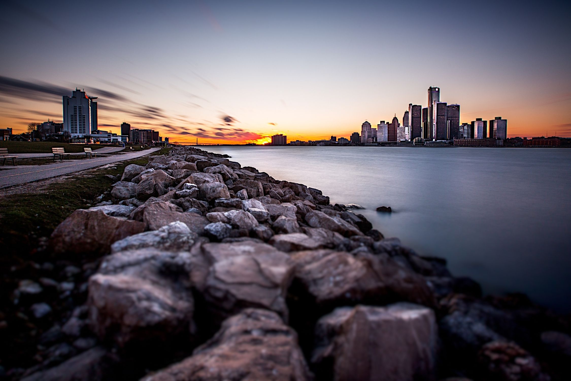 A view of Detroit and Windsor from the Windsor, Ontario riverfront trial.
